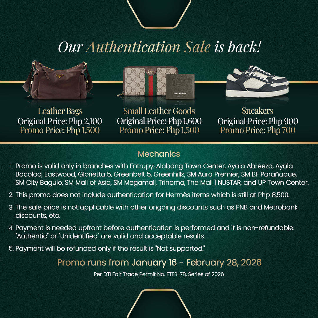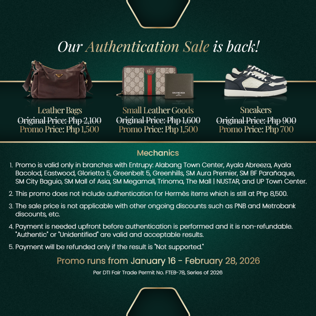 Doctor Leather offers expert authentication services powered by Entrupy, ensuring accurate, reliable results for leather bags, small leather goods, and sneakers. With the Authentication Sale running from January 16 to February 28, 2026, now is an ideal time to have your pieces verified at special rates—available in select branches nationwide: Alabang Town Center, Ayala Malls Abreeza, Ayala Malls Capitol Central, Eastwood, Glorietta 5, Greenbelt 5, Greenhills, SM Aura Premier, SM BF Parañaque, SM City Baguio, SM Mall of Asia, SM Megamall, Trinoma, The Mall | NUSTAR and UP Town Center.
